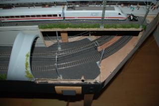 Anfangs dachte ich nur an eine Grünfläche mit Bäumen, Sträucher und Büschen. Ich habe dann mit der Umsetzung angefangen und begann, den Bereich zu gestalten. Aber irgendwie gefiel mir dieser Anlagenteil nicht so richtig. Schließlich entsorgte ich Idee mit samt dem bereits fertig gestellten Teilen. Eine neue Idee musste dringend her. Als ich fast schon aufgegeben habe, klingelte der Briefträger an der Türe und übergab mir ein Paket. Im Paket war das schon lange von mir bestelle Set des Mikroländer Clubs, welches eine Stromtankstelle für einen Elektro-Smart in Szene setzt. Sofort fiel mir eine Szenerie mit Parkplatz und wartende Fahrgästen an einer Bushaltestelle, Bäume, Hecken und Straßenlampen ein und ich begann mit den Arbeiten. Ein ein passendes Brett war schnell gesägt. Nicht einfach war es jedoch, den Anschluss zum Tunnelportal zu gestalten. Der Bereich muss stets zugänglich sein um ggfs. an entgleiste Fahrzeuge heran zu kommen. Aber schließlich habe ich auch das mit Fliegengitter und Gips umgesetzt. Das nun kleinste "Modul" der Modellbahnstadt ist fast fertig. Die Verkabelung der drei Leuchten und der