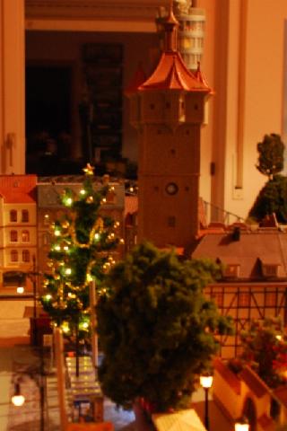 dann die Stellprobe in der Modellbahnstadt neben dem großen Stadttor. Den Weihnachtsbaum habe ich noch an den Stromkreis der Lampen und Straßen-Leuchten angeschlossen und so wird der Baum fortan in der Weihnachtszeit den Platz vor dem Stadtturm erhellen. Die Nachbildung eines Weihnachtsbaums hat nun doch länger gedauert als ursprünglich gedacht. Aber es hat Spaß gemacht. Der baum hat jedoch das vorweihnachtliche Budget doch stärker belastet als geplant. Die Material- und Herstellkosten dieses Blickfangs haben ca. 80 Euro verschlungen. Die Bilder zeigen den normalen- und den weihnachtlichen Baum. Eben ist auch noch der bestellte Weihnachtsmann und die Rentiere per Post bei mir angekommen. Gerade noch rechtzeitig vor dem großen Fest. Das Set von Preiser komplettiert die Szenerie.