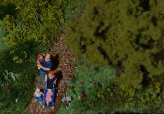 Ein bisher noch nicht gestalteter Bereich zwischen Stützmauer und Bahnsteig wurde nun auch fertig gestellt. Die Szene zeigt eine Familie, die vom Bahnsteig kommt. Gebüsche und Sträucher zieren die eher finstere und abgelegene Ecke der Modellbahnstadt. Moderne Leuchten erhellen bei Dunkelheit den Weg.